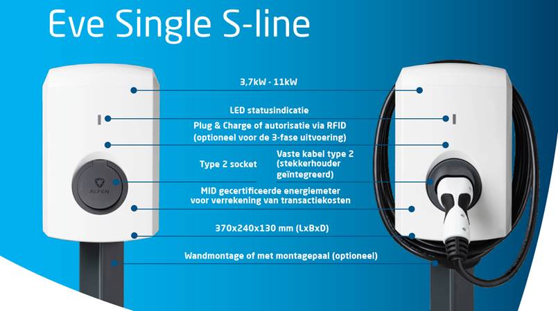 De Eve Single S-line is ontworpen om werkelijk slimme functies voor thuis opladen te bieden. De compacte behuizing bevat een laadindicatielamp en kan aan een muur of paal worden gemonteerd om een plug & play oplossing te bieden. Hij is beschikbaar als laadcontact, of verbonden met een kabel inclusief kabelopslag. Internetverbinding verloopt via ethernet met online gebruiksgegevens via E-Flux of een vrij gekozen systeem van derden.