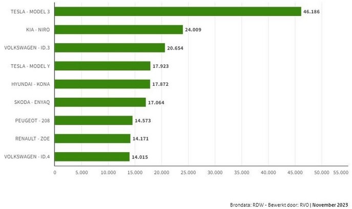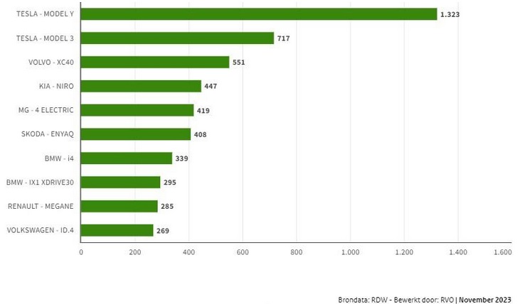 De afgelopen periode is de Tesla model Y de meest verkochte auto, met 1.123, op afstand gevolgd door de Tesla model 3 met 717 verkochte auto’s. De MG- 4 Electric is aan een opmars bezig, hiervan zijn er 419 verkocht. Dit aantal ligt in de lijn met de verkoop van de KIA Niro (447) en de Skoda Enyaq (408).