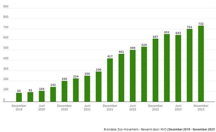 Het aantal snellaadlocaties is in vier jaar tijd enorm toegenomen. Waren er in Nederland in december 2019 nog slechts 85 snellaadlocaties, eind 2023 zijn dit er 732, ruim acht keer zoveel.