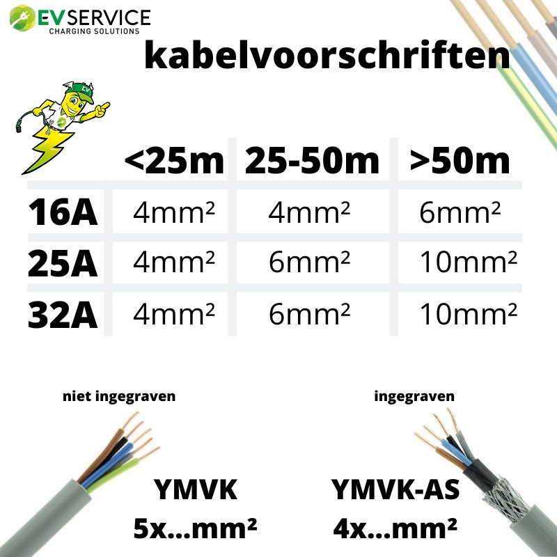 De eerste stap is de juiste bekabeling aanleggen. Zorg ervoor dat de stroomkabel voldoende dikte heeft (zie eerdergenoemd schema). Daarnaast raden we aan om altijd een datakabel mee te trekken. Een datakabel is bijvoorbeeld een vereiste voor load balancing (een techniek wat voorkomt dat de stroomaansluiting overbelast wordt). Je krijgt ongetwijfeld spijt als je deze nu niet direct meetrekt en later alsnog load balancing nodig hebt.